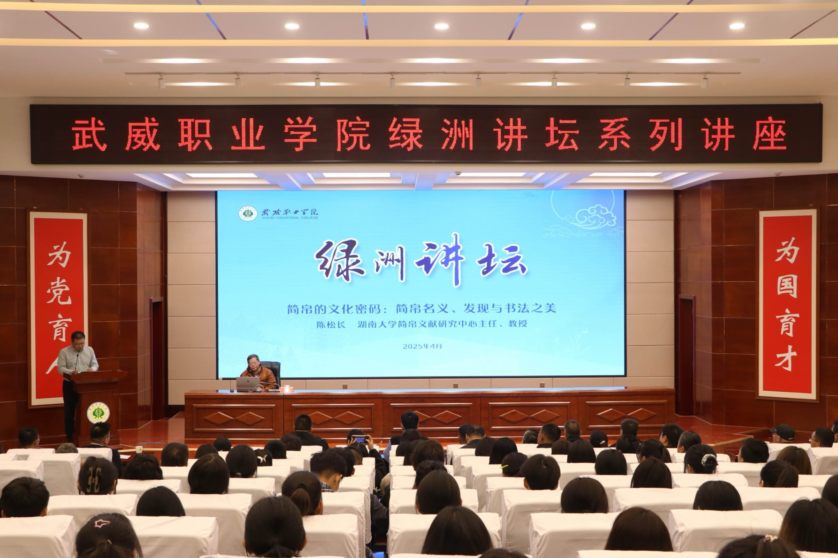 為豐富師生學術視野,深入探究歷史文化的獨特魅力,4月15日,學校特邀湖南大學岳麓書院教授、博士生導師、湖南大學簡帛文獻研究中心和中國簡帛書法藝術研究中心主任陳松長教授,在菁英廳作了“簡帛的文化密碼:簡帛名義、發(fā)現(xiàn)與書法之美”專題講座。校長李海軍主持講座,湖南大學師生代表、武威市涼州文化研究院研究人員、學校師生代表、媒體記者共210余人參加。