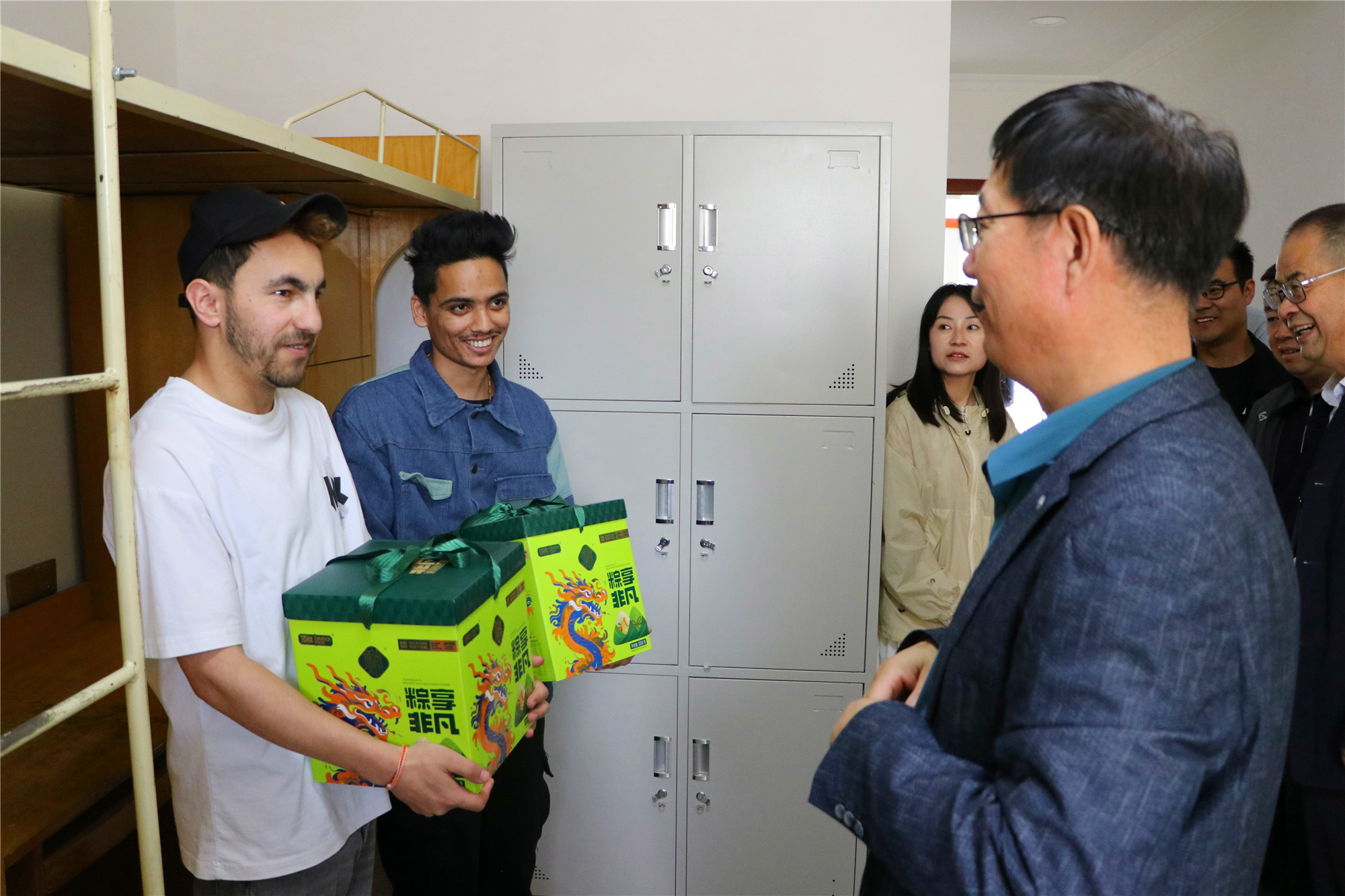 端午將至,為更好開展留學生教育管理工作,使我校來華留學生更好地認識和體驗中國傳統(tǒng)節(jié)日文化,5月30日,學校黨委副書記、副校長張開禮,黨委副書記翟存祥,黨委委員、副校長王守云一行與國際合作交流處全體工作人員走進留學生公寓,給留學生們送去節(jié)日的關懷和溫暖。