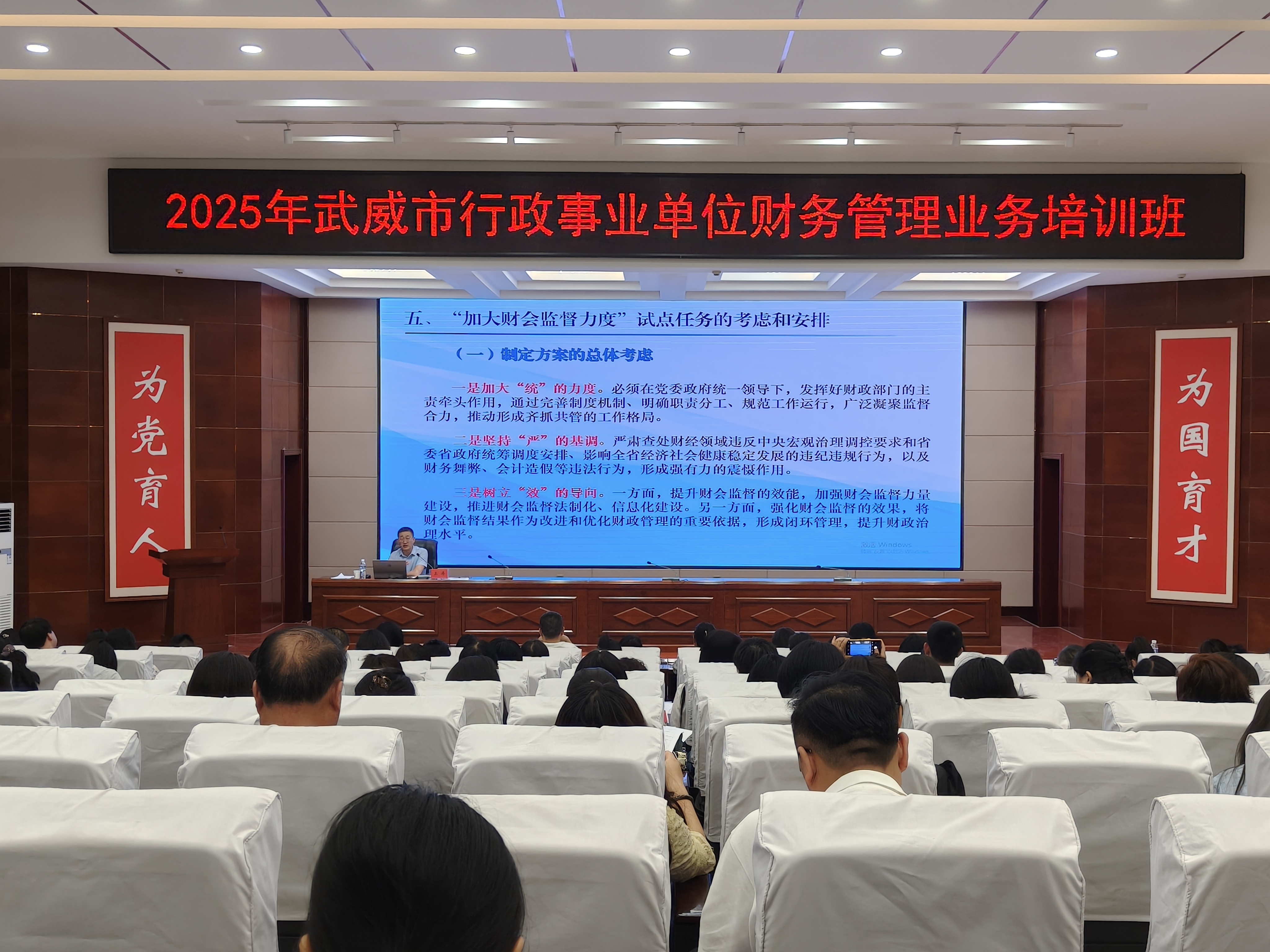 為深入貫徹實施新《會計法》,進一步做好2025年全市行政事業(yè)單位財會人員素質提升和崗位能力培訓工作,根據市財政局局黨組年初工作安排,6月11日-12日,由武威市財政局主辦,學校承辦的全市行政事業(yè)單位財務管理業(yè)務培訓班在菁英廳順利舉行。全市行政事業(yè)單位財務業(yè)務骨干及業(yè)務人員共180余人參加了培訓。