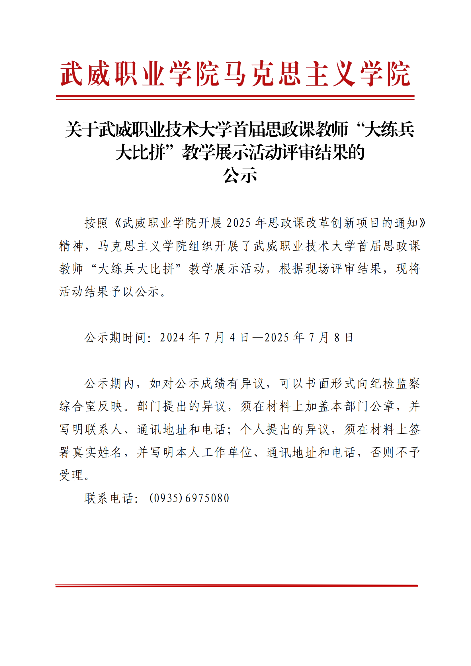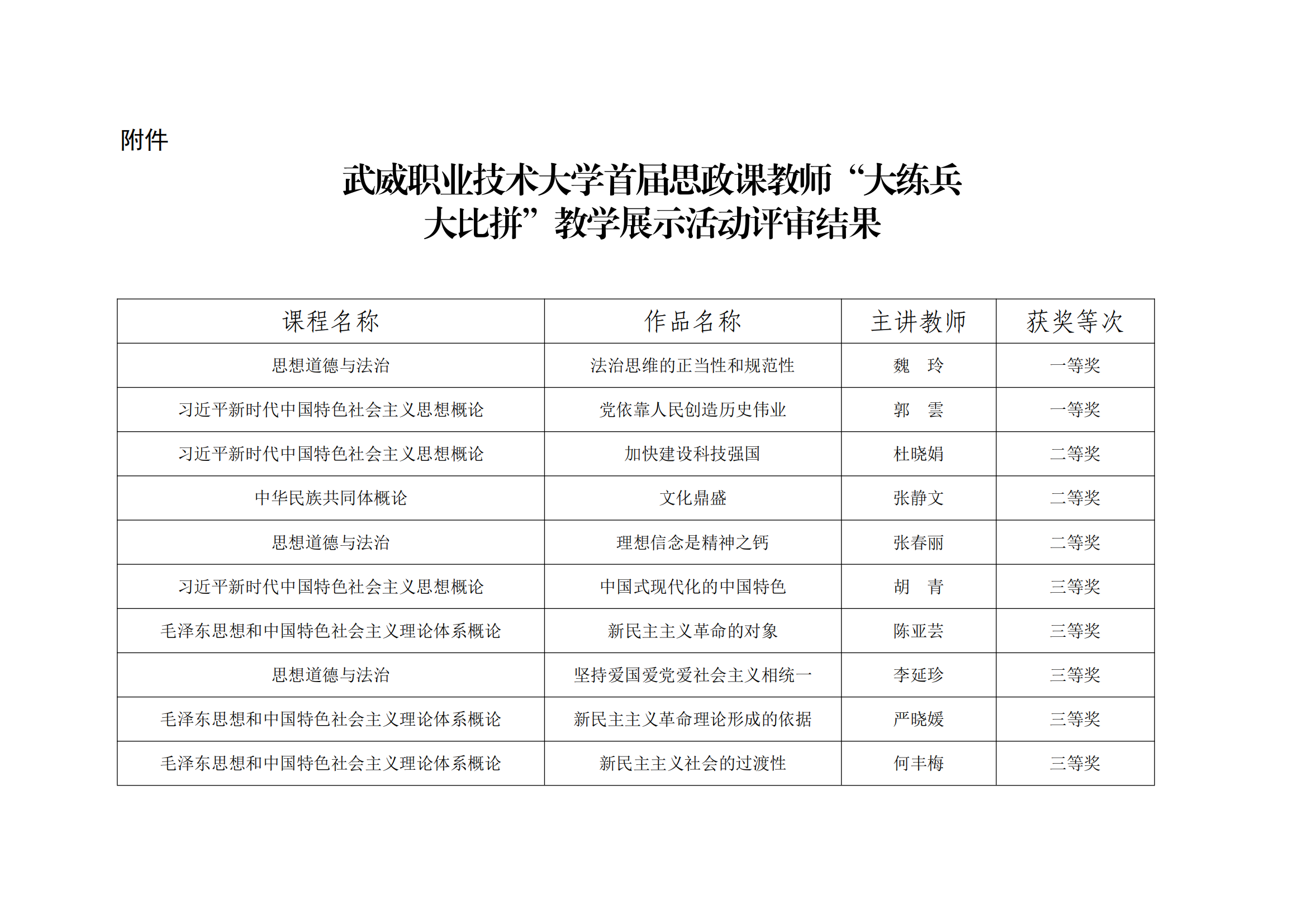 武威職業(yè)技術(shù)大學(xué)首屆思政課教師“大練兵大比拼”教學(xué)展示活動(dòng)評(píng)審結(jié)果的公示