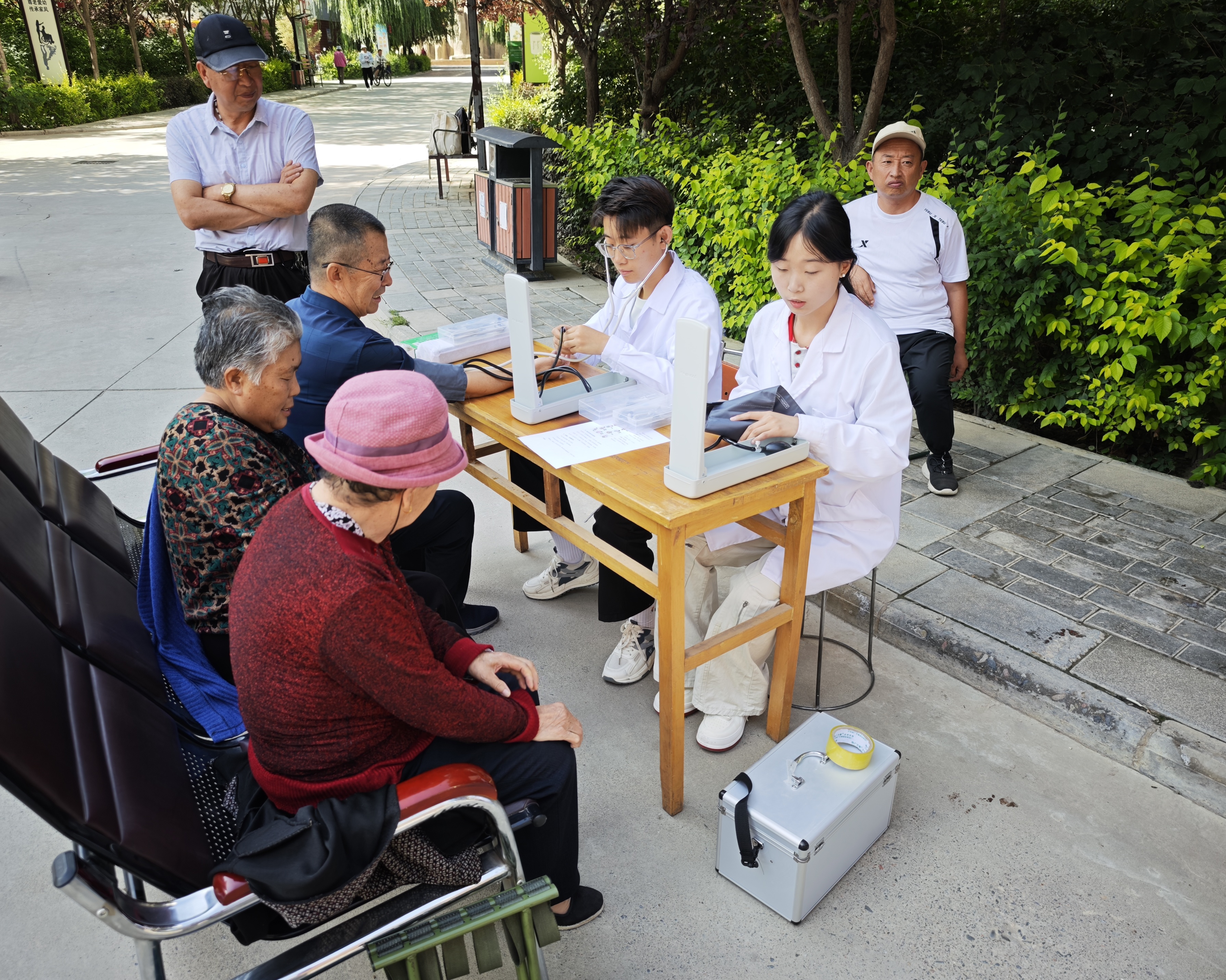 在指導(dǎo)老師的帶領(lǐng)下,志愿者們走進武威市涼州區(qū)窯溝村,他們手持血壓計為村民細心測量,指尖傳遞著溫暖的守護。針對常見的高血壓問題,志愿者們將書本的醫(yī)學(xué)知識化作“少鹽多醋常走動”的貼心叮嚀;艾灸棒在老人膝蓋處揮舞,老人們微闔雙眼,皺紋間舒展開寧靜的笑意。志愿者精心準備了蘊含中藥智慧的五色香囊,讓預(yù)防保健的種子在老人們心中生根發(fā)芽。