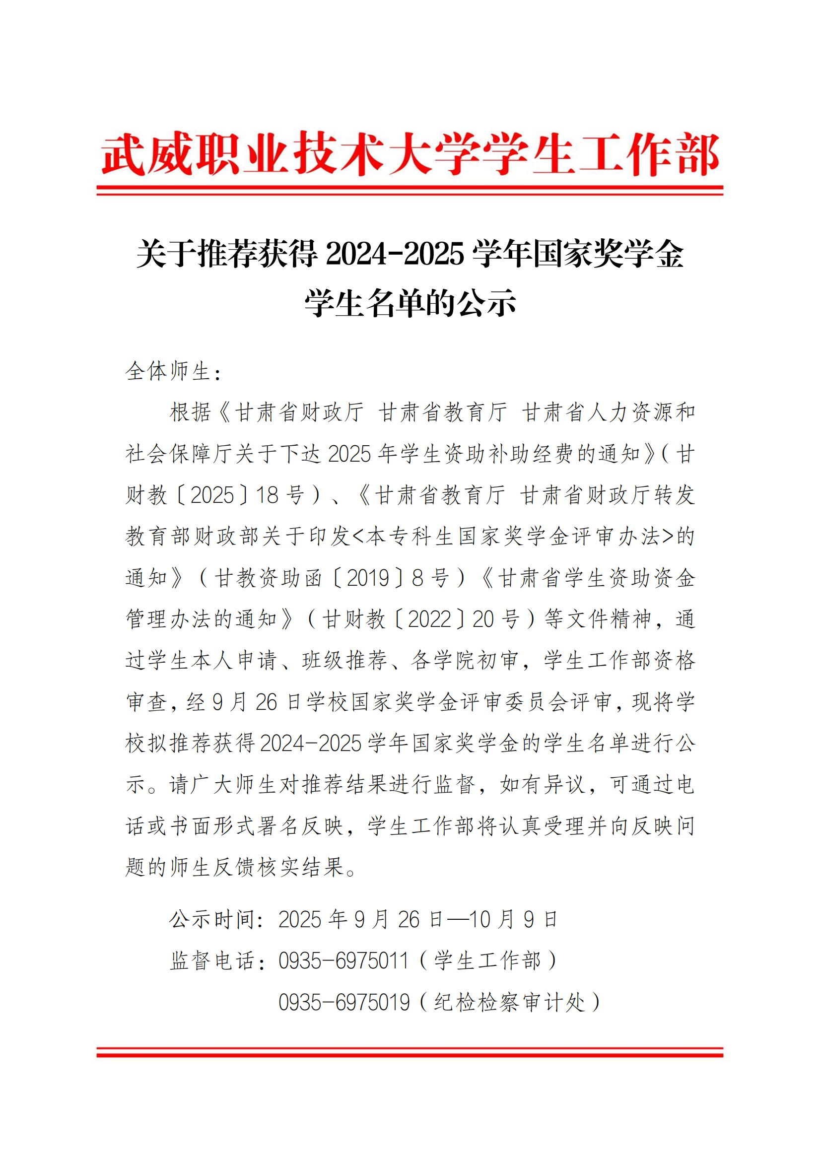 甘肅省武威師范學(xué)校關(guān)于2025-2026學(xué)年國(guó)家助學(xué)金評(píng)選結(jié)果的公示