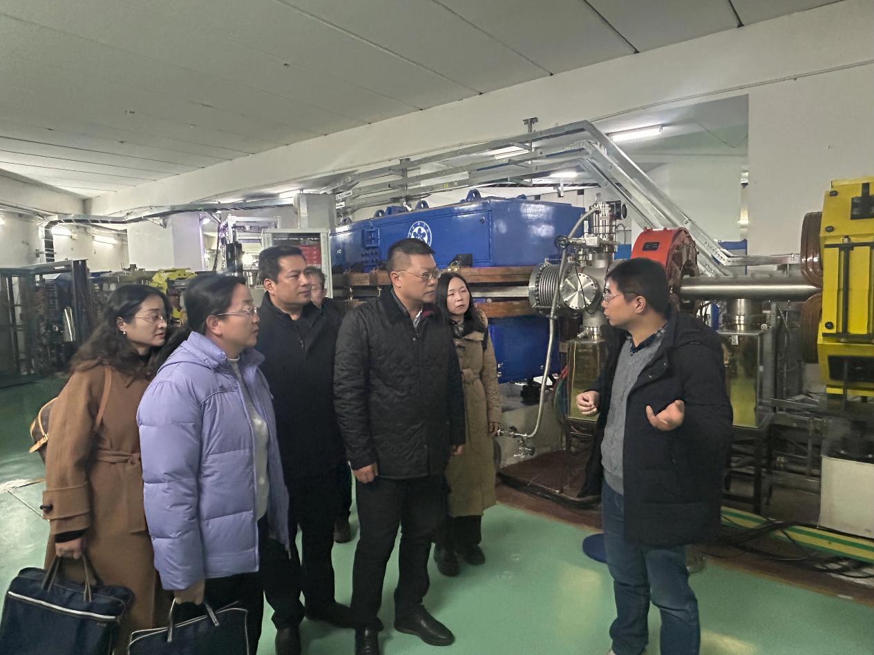 隨后,在醫(yī)用探測器室主任毛瑞士與副主任徐治國的陪同下,調(diào)研組實地參觀了“國之重器”——蘭州重離子加速器裝置,詳細(xì)了解了其結(jié)構(gòu)組成、運行機制與核心技術(shù)原理。毛瑞士結(jié)合該裝置在重離子醫(yī)用探測器研發(fā)、醫(yī)用束測控制等領(lǐng)域的實際應(yīng)用,闡釋了核探測技術(shù)對提升醫(yī)學(xué)診療精度的支撐作用,使調(diào)研組成員切身感受到大科學(xué)裝置的科技魅力與實用價值。