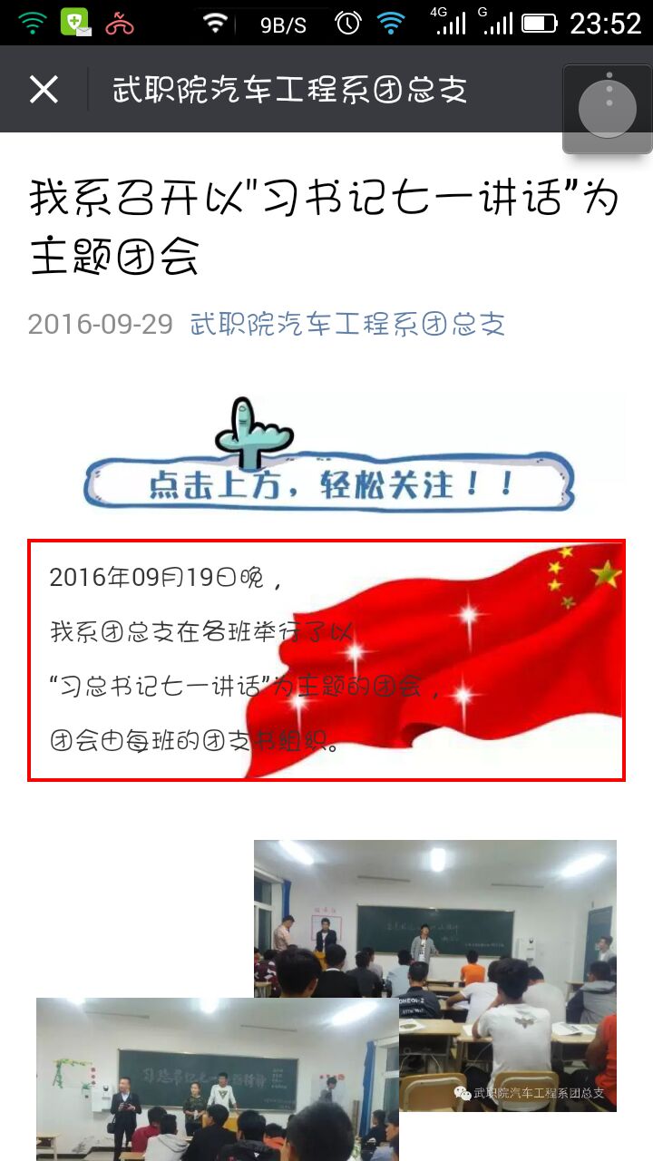 為深入推進我系各級團組織、團干部和團員青年學(xué)習(xí)習(xí)近平總書記“七一”重要講話精神,根據(jù)院團委統(tǒng)一安排,汽車工程系團總支于9月下旬在各班以主題團會、座談會、黑板報等形式展開學(xué)習(xí)討論,并在系微信、微博公眾平臺上進行了宣傳教育。