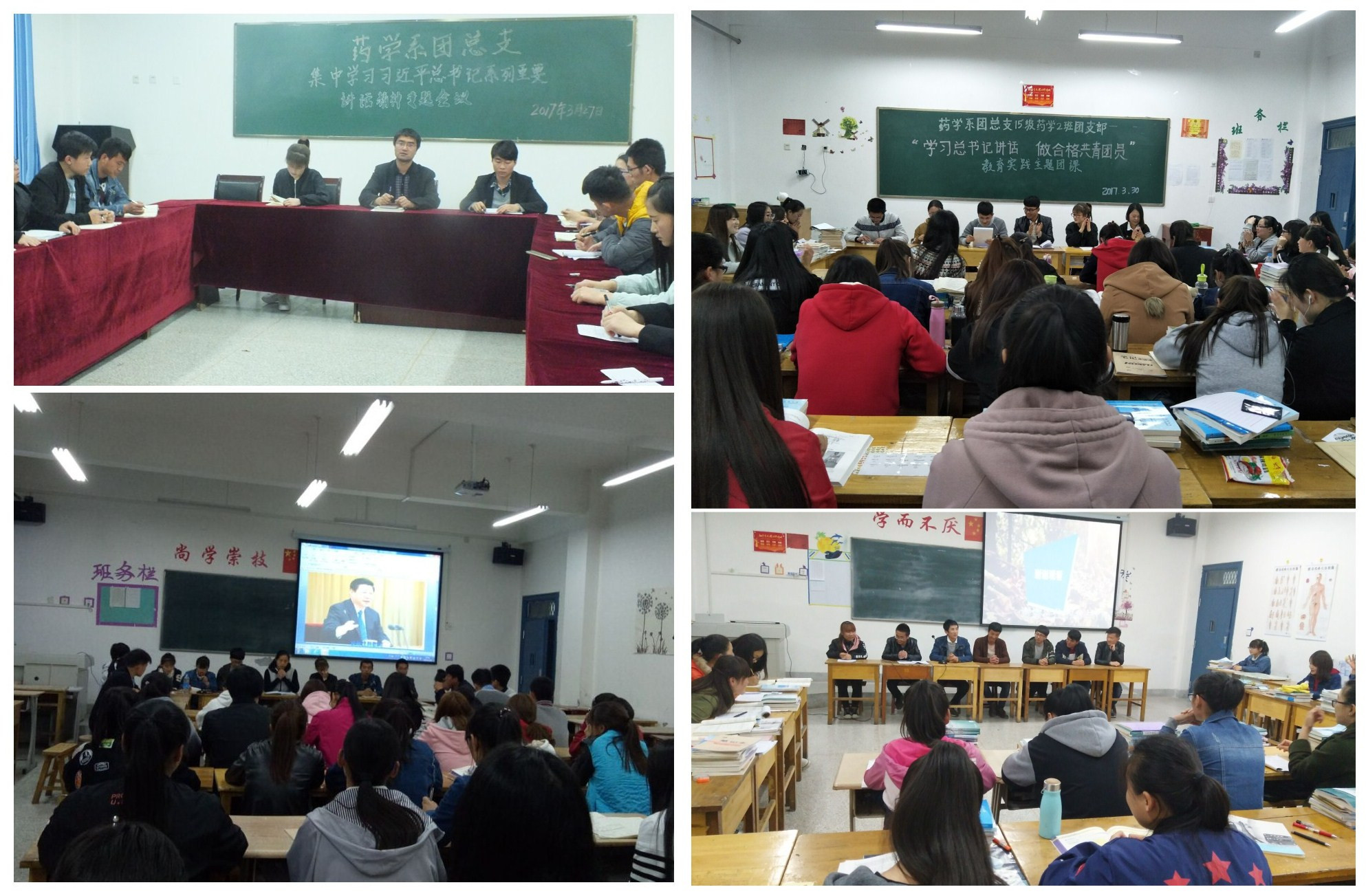 3月27至3月31日,藥學(xué)系團(tuán)總支在系黨總支的周密安排和精心指導(dǎo)下,結(jié)合院團(tuán)委開展“一學(xué)一做”教育實(shí)踐的總體部署,組織各班團(tuán)支部在明遠(yuǎn)樓各班教室集中開展了學(xué)習(xí) “習(xí)近平總書記在中國科學(xué)技術(shù)大學(xué)視察和在知識分子、勞動模范、青年代表座談會上重要講話精神”,并觀看相關(guān)教育視頻。視頻中,習(xí)近平總書記向廣大青年寄予厚望,專門對大學(xué)生提出了“做有理想、有追求的大學(xué)生,做有擔(dān)當(dāng)、有作為的大學(xué)生,做有品質(zhì)、有修養(yǎng)的大學(xué)生”的明確要求,并勉勵廣大青年“踏踏實(shí)實(shí)做事,踏踏實(shí)實(shí)做人”。