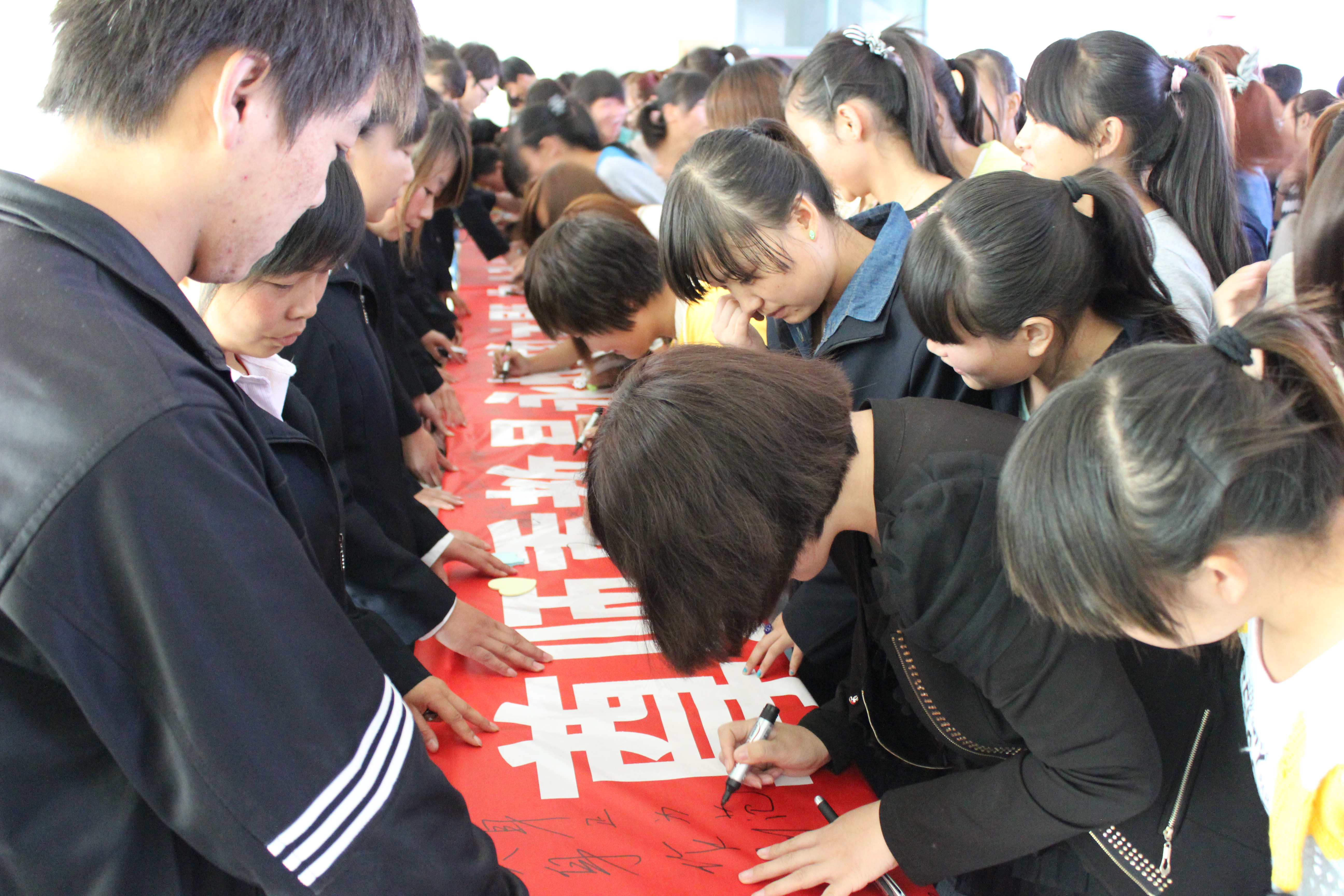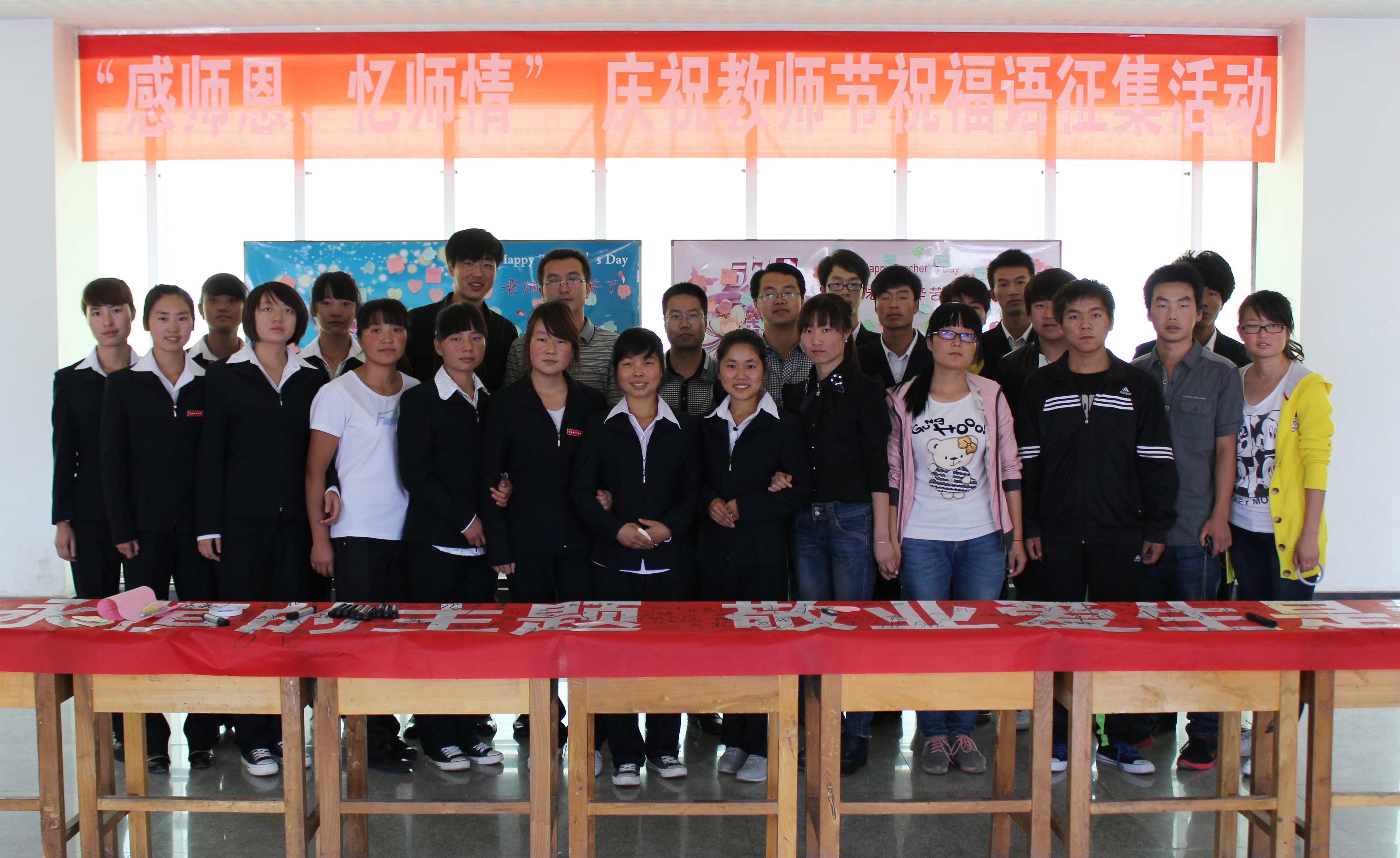 又是金秋九月,第29個教師節(jié)踏著輕盈的腳步緩緩而來。 今天,電子信息工程系舉辦“感師恩、憶師情”慶祝教師節(jié)祝福語征集暨師生簽名活動。早晨七點三十分,活動在一聲聲“老師,您辛苦了!祝您教師節(jié)快樂!”的祝福中拉開帷幕。上午十點,電子信息工程系全體教師和300多名學生在一號教學樓三樓參加了主題簽名儀式,并將祝??ㄙN在主題海報上。