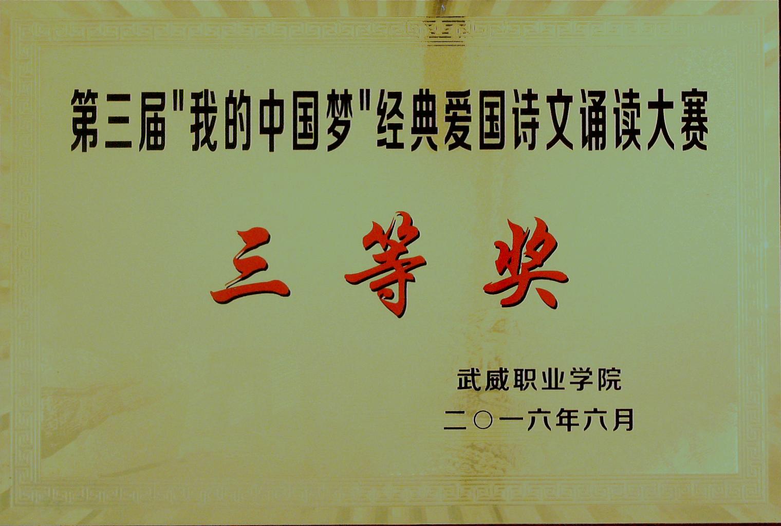 第三屆“我的中國夢”經(jīng)典愛國詩文誦讀大賽三等獎