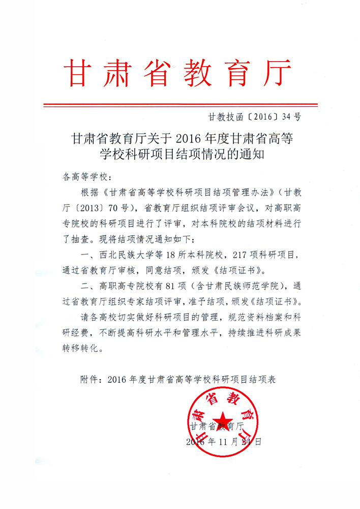 甘肅省教育廳關(guān)于2016年度甘肅省高等學(xué)??蒲许椖拷Y(jié)項情況的通知