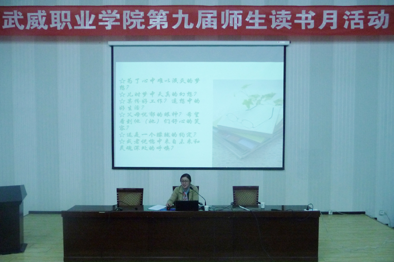 為在全院師生中營(yíng)造良好的讀書氛圍,豐富校園文化生活,在第22個(gè)世界讀書日來臨之際,4月20日,武威職業(yè)學(xué)院第九屆讀書月活動(dòng)專題講座在正德廳舉行。學(xué)院中文專業(yè)副教授、電子信息工程系主任李亞梅應(yīng)邀進(jìn)行了《為何而讀書》的專題講座,近300名師生參加了此次講座。
