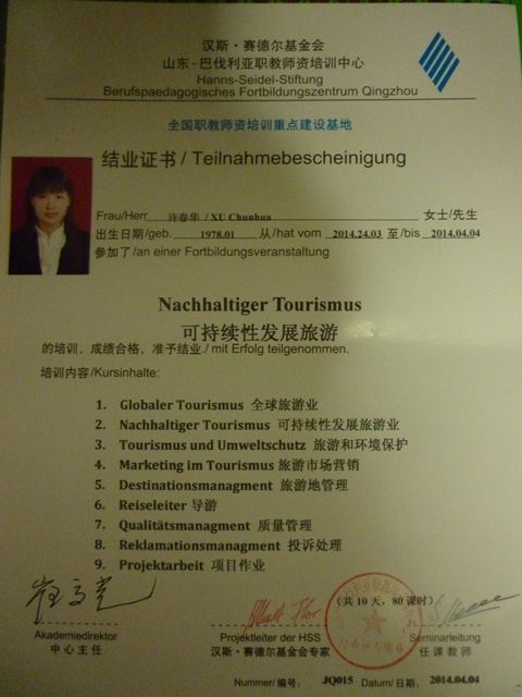 2014年3月24日至4月4日,我院旅游管理專業(yè)骨干教師馬靜、許春華參加了德國漢斯·賽德爾基金會(Hanns Seidel Stiftung)在酒泉職業(yè)技術(shù)學院舉辦的“可持續(xù)性發(fā)展旅游”師資培訓班。