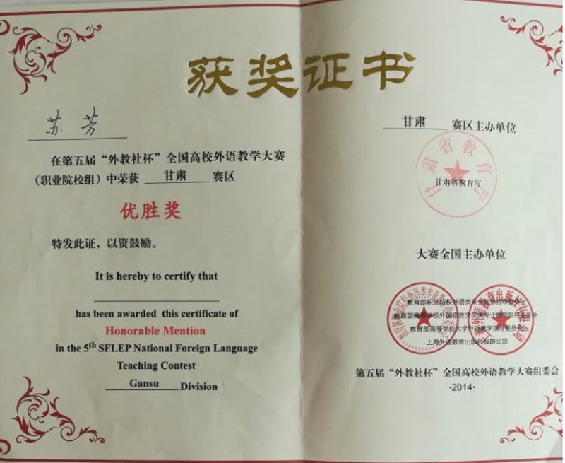 蘇芳榮獲2014年第五屆“外教社”杯全國高校外語教學大賽(職業(yè)院校組)甘肅賽區(qū)優(yōu)勝獎