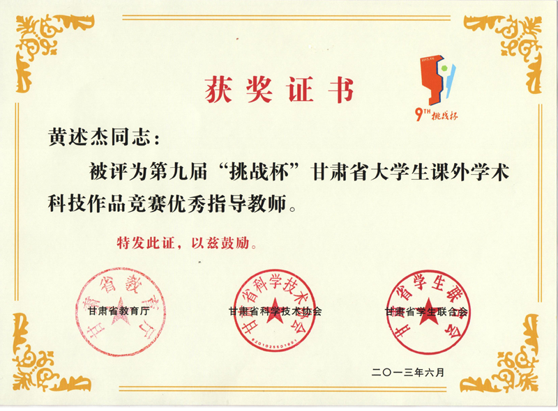 黃述杰榮獲第九屆“挑戰(zhàn)杯”甘肅省大學生課外學術(shù)科技作品競賽優(yōu)秀指導教師
