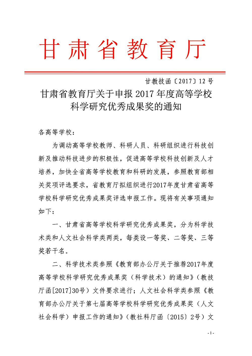 轉(zhuǎn)發(fā)甘肅省教育廳關(guān)于申報(bào)2017年度高等學(xué)校科學(xué)研究?jī)?yōu)秀成果獎(jiǎng)的通知