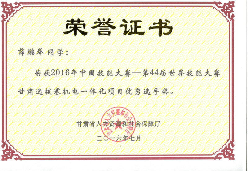2016年中國(guó)技能大賽甘肅選拔賽機(jī)電一體化技術(shù)項(xiàng)目?jī)?yōu)秀獎(jiǎng)