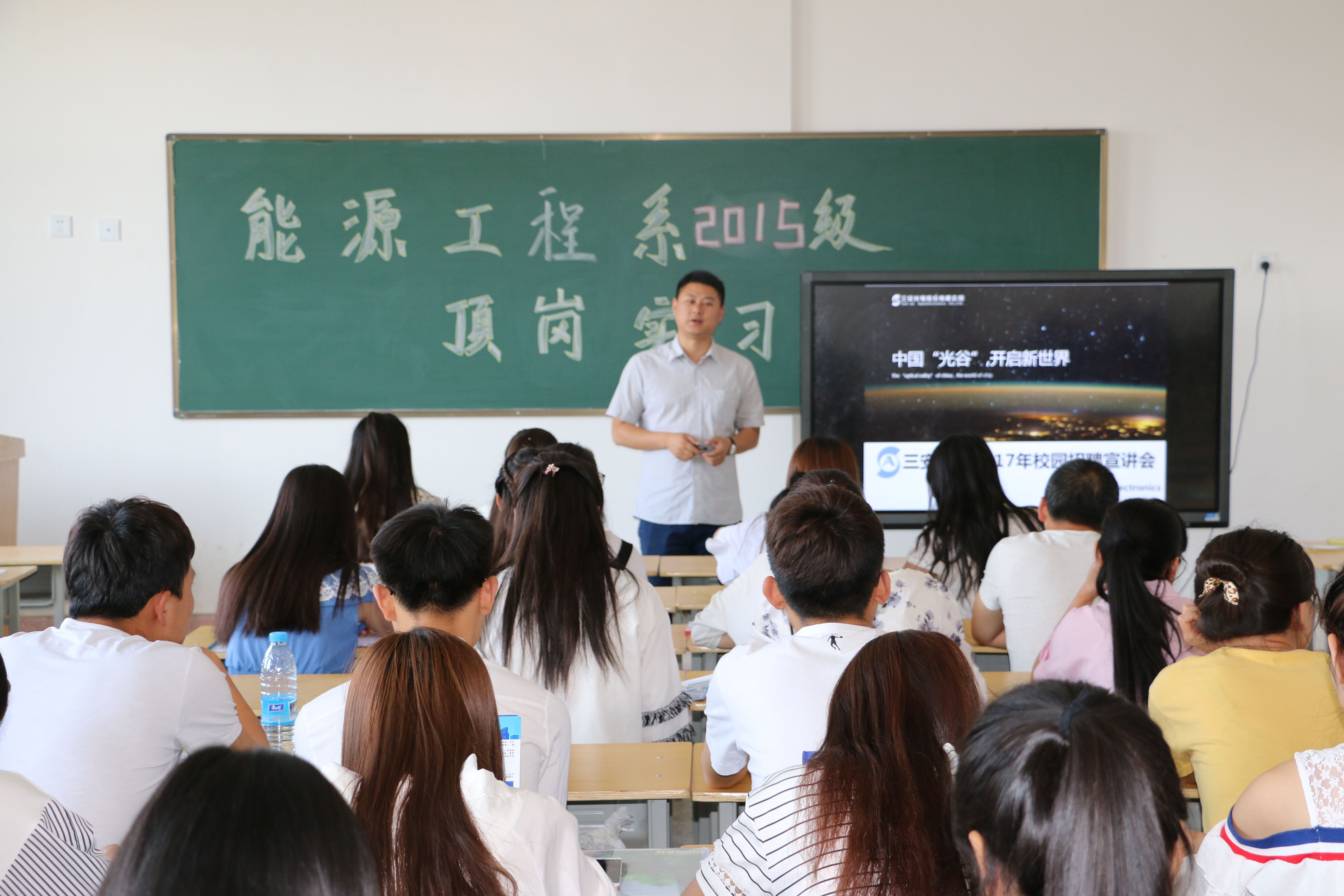 為進(jìn)一步深化校企合作,提供更優(yōu)質(zhì)的頂崗實(shí)習(xí)崗位,6月26日早上,能源工程系邀請(qǐng)校企合作企業(yè)安徽三安光電有限公司和晶科能源有限公司工作人員在我系洽談校企合作事宜,并對(duì)即將進(jìn)入實(shí)習(xí)的2015級(jí)學(xué)生做頂崗實(shí)習(xí)宣講。
