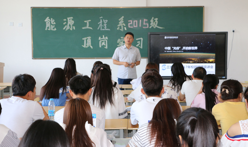 為進(jìn)一步深化校企合作,提供更優(yōu)質(zhì)的頂崗實(shí)習(xí)崗位,6月26日早上,能源工程系邀請(qǐng)校企合作企業(yè)安徽三安光電有限公司和晶科能源有限公司工作人員在我系洽談校企合作事宜,并對(duì)即將進(jìn)入實(shí)習(xí)的2015級(jí)學(xué)生做頂崗實(shí)習(xí)宣講。