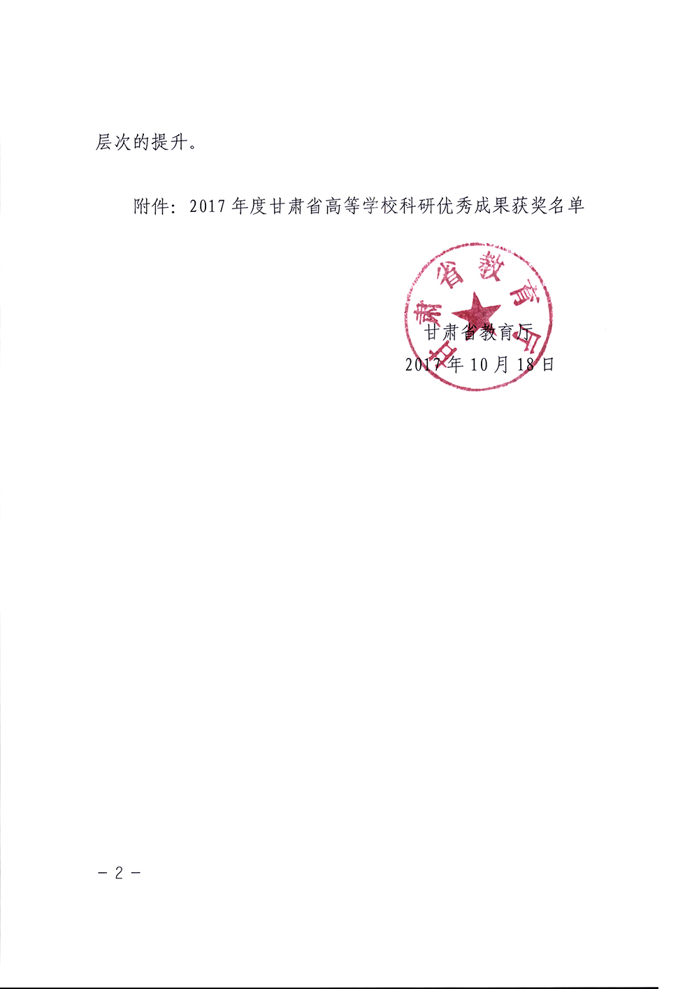 2017年度甘肅省高等學(xué)??蒲袃?yōu)秀成果獎勵證書